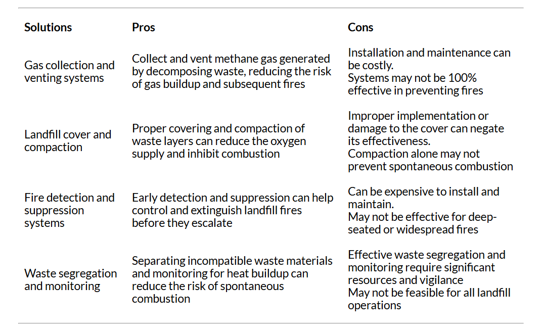 What solutions are currently being employed to prevent and manage landfill fires, and what are their respective pros and cons?